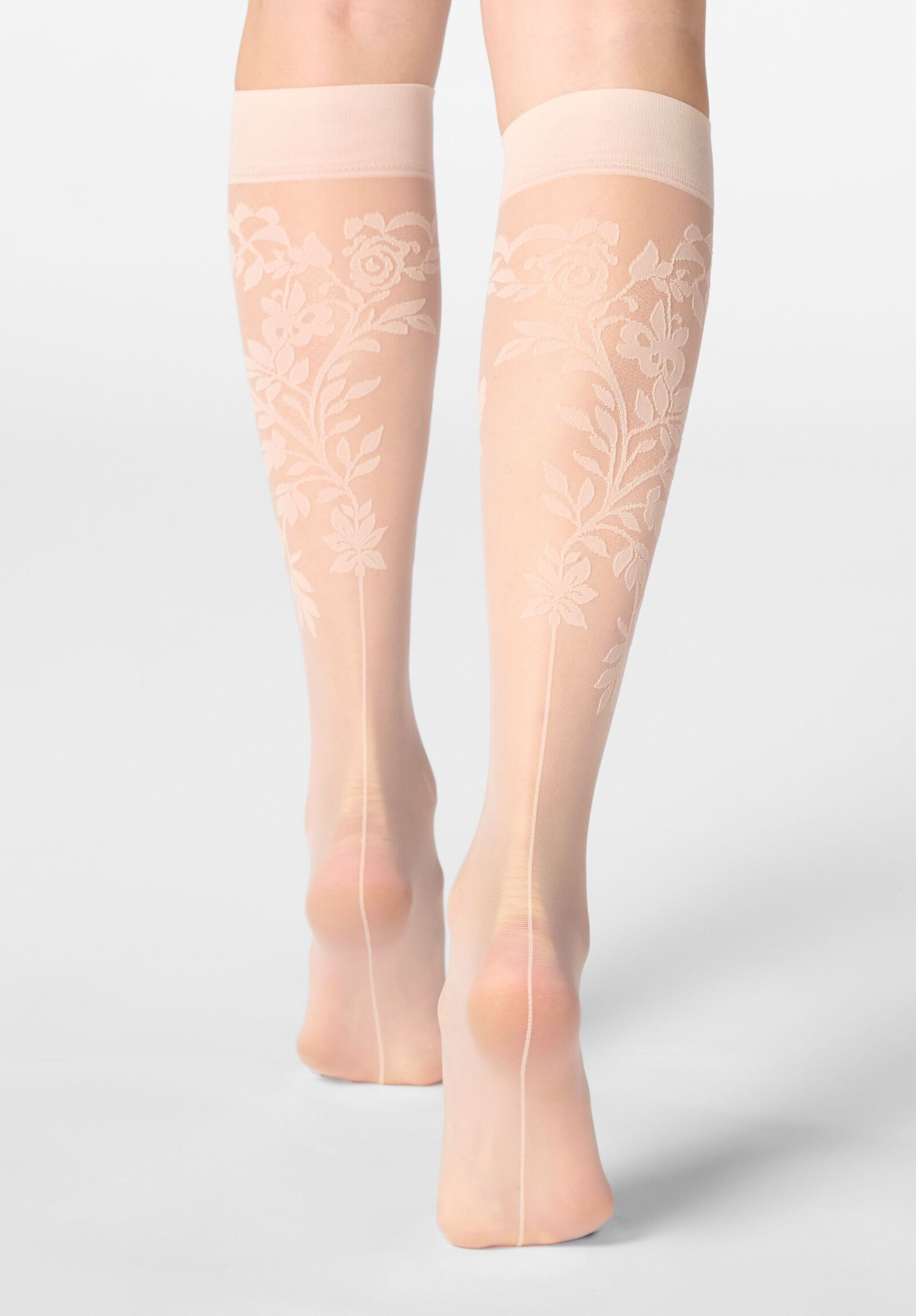 These sheer knee-highs with a thin central seam are the ideal accessory for those who want an elegant and refined look. The vertical stripe visually slims the leg, creating a sophisticated and modern effect, while the lace adds a feminine and distinctive touch. The sheer fabric gives it a light and refined feel, making it perfect for pairing with both everyday and more formal outfits. The flat, comfortable cuff ensures a flawless fit without leaving marks on the skin, guaranteeing comfort even after many hours of wear. A knee-high that combines style, femininity and practicality, enhancing every step with an elegant and original detail.