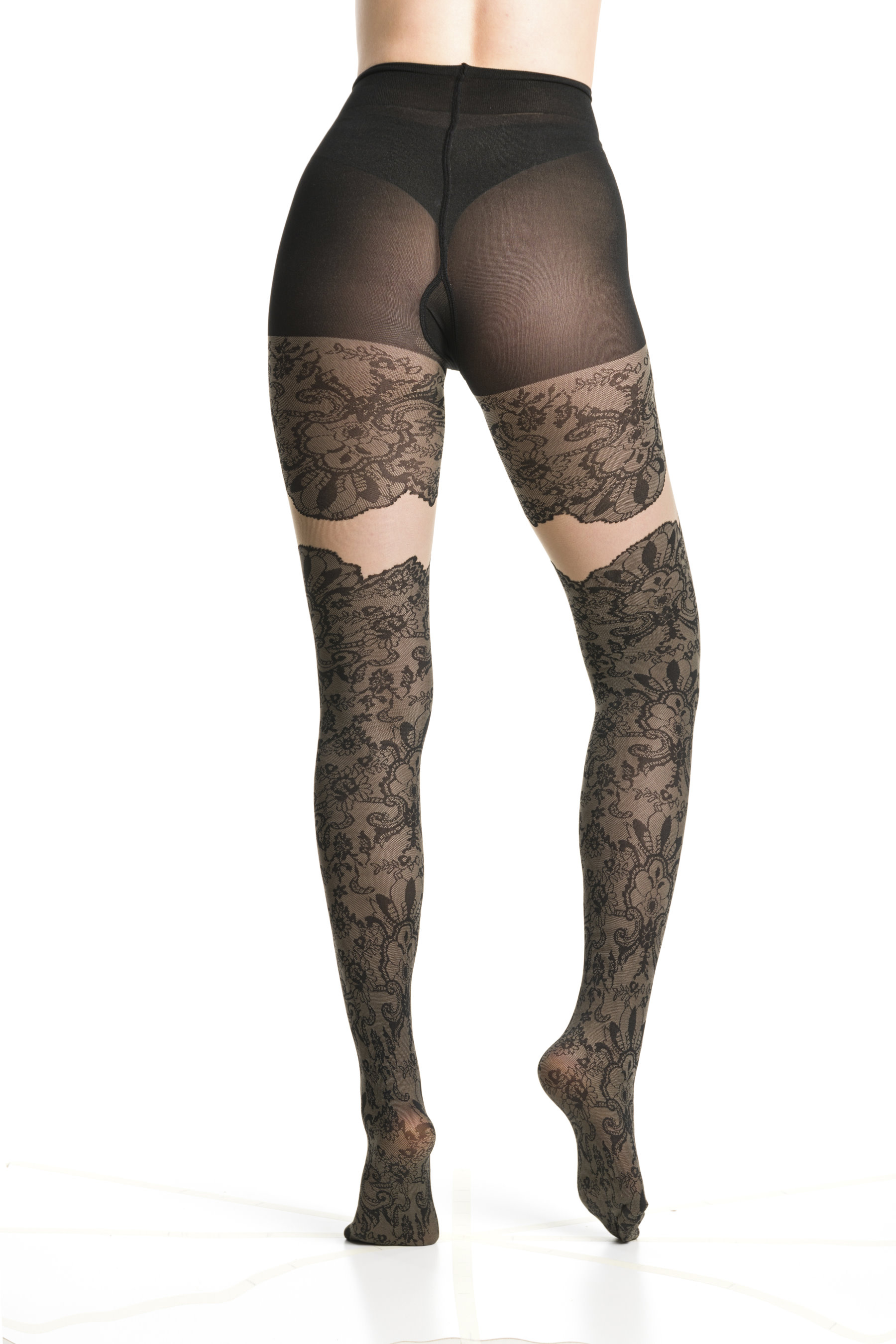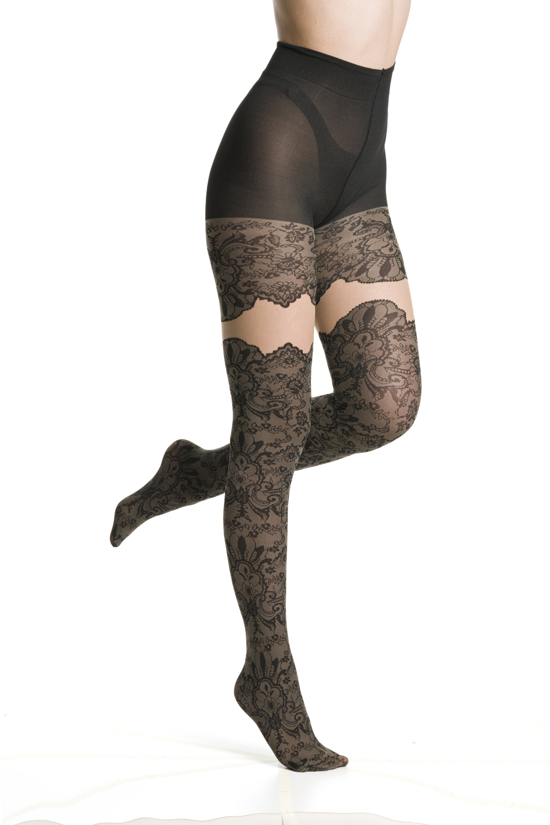 Elegant mock hold up tights with sensuous sheer details and lace pattern. 20 denier/50 denier